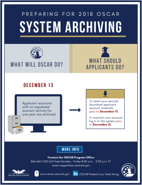 It's that time of year again! The OSCAR Program Office will soon perform its annual system archiving to prepare for law clerk hiring in 2019. This is done once a year to make room for new applicants, positions, and applications--and to help the site run faster.
